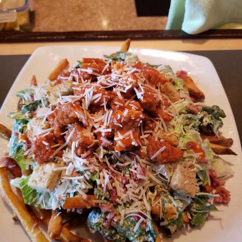 Fresh Cut Fries topped with Breaded Chicken Tossed in any Wing Sauce, Topped with Cheese Curds & Gravy